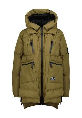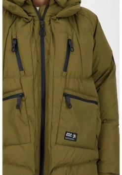 Warm wattierter Parka; große Kapuze; wasserdichter, hinterlegter Frontreißverschluss mit Druckknopfleiste; integrierte, enganliegende Gamaschen; je 2 Brust- und Fronttaschen mit wasserdichten Reißverschlüssen und Zipgaragen; die langen Reißverschlüsse in den Seitennähten mit Dreieckseinsatz, sorgen für mehr Bewegungsfreiheit wenn sie gebraucht wird; verlängerte Zippbändchen; wärmendes Fleecefutter; veganes Produkt; Material I 100% Polyester, Material II 100% Polyester (recycelt).