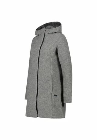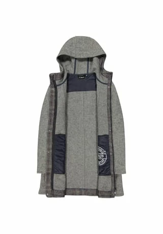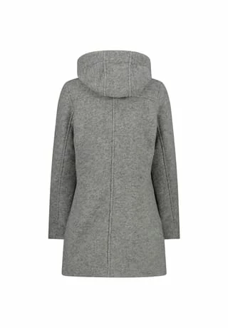 Warmer, melierter Mantel aus recyceltem Wolltech mit großer, umschlagbarer Kapuze; Druckknopfleiste mit Blende; 2 praktische Seitentaschen mit Reißverschluss; formgebende Nähte; Material I 70% Polyester, 30% Schurwolle, Material II 100% Polyester.