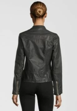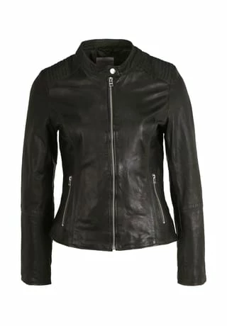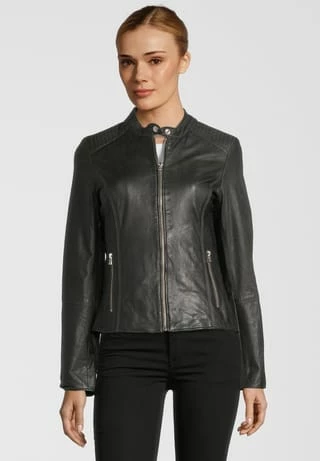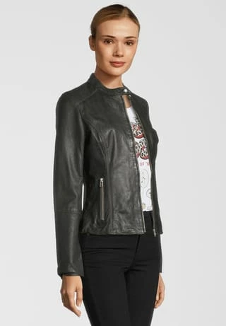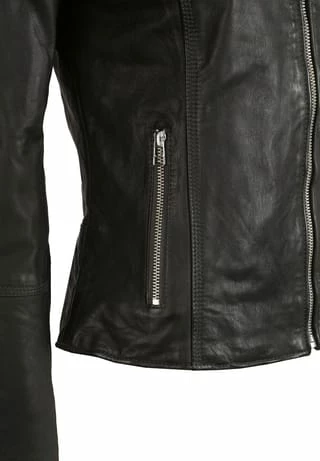 Feminine Bikerjacke aus supersoftem Leder von GOOSECRAFT. Die kurz und tailliert geschnittene Jacke ist aus matt pudrigem Schafsleder gefertigt und bekommt durch die Steppnähte auf den Schultern, den Stehkragen mit Druckknopf und die Reißverschlüsse an den Ärmelabschlüssen ihre lässige Biker-Attitüde.