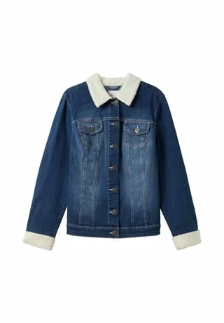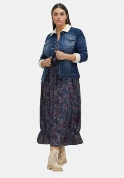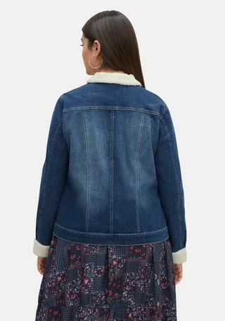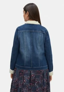Die Jeansjacke von sheego erhält durch das Fellimitat an Kragen und Ärmelabschluss einen kuscheligen Twist. Ansonsten zeigt sich die Jacke klassisch mit Umlegekragen und durchgehender Knopfleiste, die Brusttaschen sind mit Patten und Knopf gearbeitet. Markante Teilungsnähte betonen geschickt den taillierten Schnitt, durch die individuelle Waschung erhält die Jacke Lässigkeit. Hinten sorgt die Passe für einen guten Sitz.