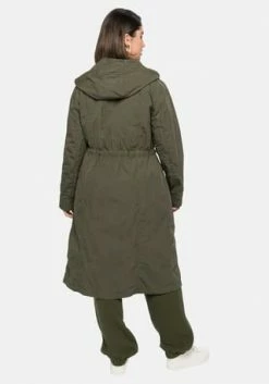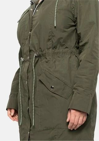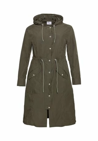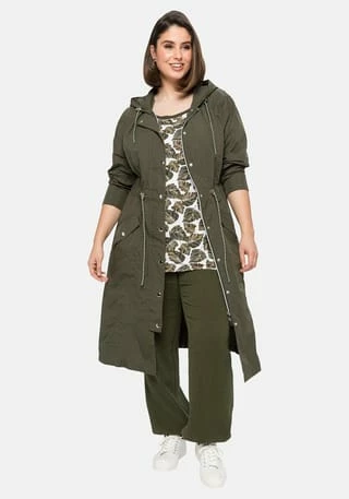 Der in A-Linie geschnittene Sommermantel von sheego zeigt sich mit Kapuze und großen Pattentaschen mit Druckknöpfen. Der Tunnelzug in der Taille und die geschickt gesetzten Teilungsnähte definieren die Silhouette, die Schulterpassen vorn und hinten geben dem Mantel einen schönen Fall. Ein durchgehender Reißverschluss und die verdeckte Knopfleiste ergänzen den sportiven Look.