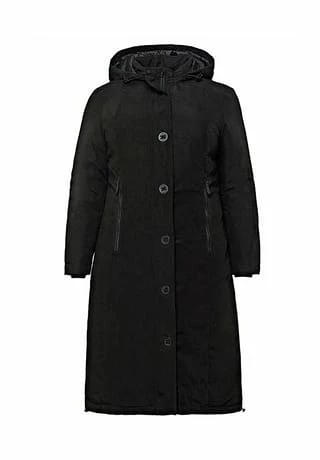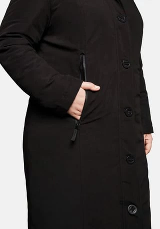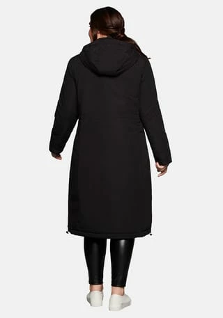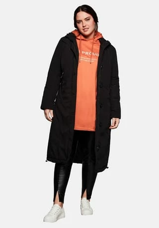 Ein optimaler Outdoor-Begleiter ist der leicht wattierte Kapuzenmantel von sheego. Der robuste Style zeigt sich außen mit glatter Oberfläche, die Innenseite ist gesteppt. Ein Tunnelzug in der Kapuze, die Rippbündchen am Ärmelabschluss und die mit langen, mit Zippern verschließbaren Taschen machen ihn wind- und wetterfest. Die knielange A-Linie lässt sich durch den Tunnelzug seitlich am Saum in der Weite regulieren, geschlossen wird der Mantel mit einem verdeckten 2-Wege-Reißverschluss. Die aufwendige Knopfleiste ist dazu eine dekorative Ergänzung.