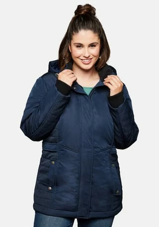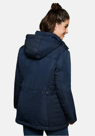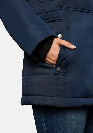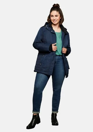 In sportiver Optik zeigt sich diese Outdoorjacke von sheego. Die pflegeleichte Jacke ist mit einer wärmenden Wattierung ausgestattet und wird durch eine Kapuze mit regulierbarem Tunnelzug ergänzt. Kontrasteinsätze in melierter Optik an der Kapuze, an den Ärmeln und an der Seite unterbrechen modisch den Look und strecken gleichzeitig die Figur. Durch die verstellbaren Riegel seitlich in der Taille lässt sich die Passform optimieren. Auch die Schulterpasse vorn und hinten sowie die Teilungsnähte sorgen zusätzlich für einen perfekten Sitz. Zwei praktische Leistentaschen mit Druckknopfverschluss und die enganliegenden, gerippten Ärmelbündchen halten die Hände schön warm. Zum Schutz gegen den Wind lässt sich der Stehkragen mit dem durchgehenden Reißverschluss bis nach oben verschließen.
