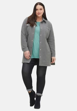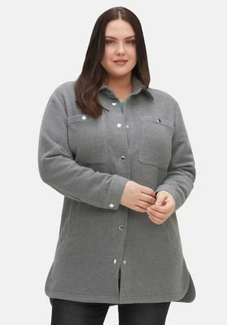 Das Shacket von sheego zeigt sich mit Umlegekragen, Brusttaschen und Ärmelmanschetten im sportiven Hemdblusenstil. Es ist mit einer Druckknopfleiste gearbeitet, auch an den Manschetten der Ärmel und auf den Brusttaschen fallen Druckknöpfe ins Auge. Der lange Schnitt mit verlängertem Rückenteil erhält durch die seitlichen Schlitze mehr Bewegungsfreiheit. Die abgerundeten Kanten wirken weich und harmonisch. In pflegeleichter, leicht angerauter Qualität.