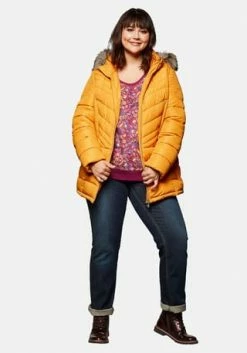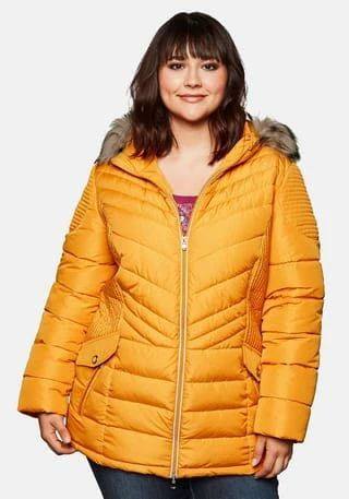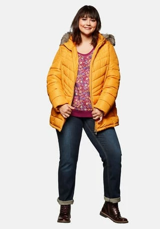 Perfekt für kühle Wintertage ist die Steppjacke von sheego. Besonders praktisch ist die abnehmbare Kapuze mit modischem Fellimitat. Zwei Eingrifftaschen mit Reißverschlüssen und Zierpatten vorn ergänzen den Look. Geschlossen wird die Jacke durch einen praktischen 2-Wege-Reißverschluss. Für eine figurschmeichelnde Silhouette sorgt die besondere Steppung. Mit Rippbündchen am Ärmelsaum. Aus angenehm tragbarer Stepp-Qualität.