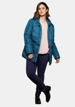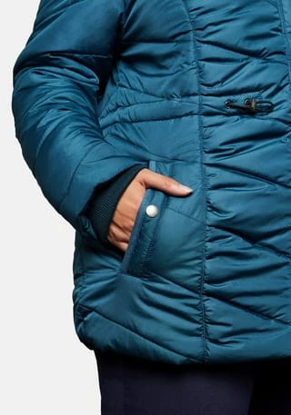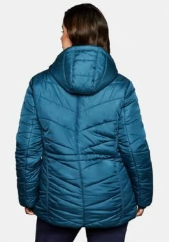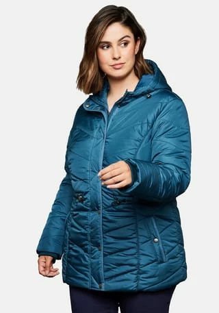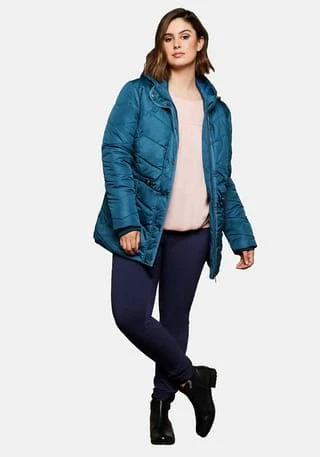 Diese sheego Kapuzen-Steppjacke ist mit einem verdeckten Reißverschluss und einer Knopfleiste versehen. Besonders dekorativ sind die Teilungsnähte mit Raffungen und die Rippbündchen an den Ärmelabschlüssen. Vorn befinden sich zwei Leistentaschen mit Druckknöpfen. Die engere Passform mit Tunnelzug in der Taille betont die Figur gekonnt. Besonders angenehm ist die wärmende Wattierung.