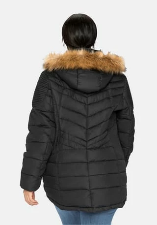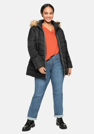 Perfekt für kühle Wintertage ist die Steppjacke von sheego. Besonders praktisch ist die abnehmbare Kapuze mit modischem Fellimitat. Zwei Eingrifftaschen mit Reißverschlüssen und Zierpatten vorn ergänzen den Look. Geschlossen wird die Jacke durch einen praktischen 2-Wege-Reißverschluss. Für eine figurschmeichelnde Silhouette sorgt die besondere Steppung. Mit Rippbündchen am Ärmelsaum. Aus angenehm tragbarer Stepp-Qualität.