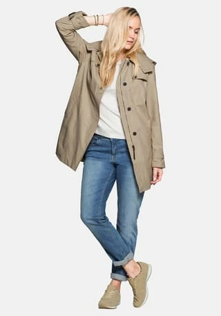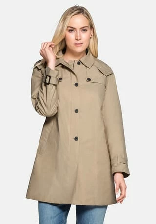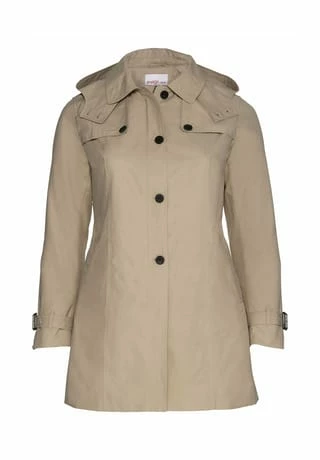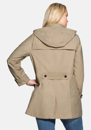 Trenchcoat aus der sheego Casual Kollektion mit abnehmbarer Kapuze und verdecktem Frontreißverschluss mit Knöpfen. Außerdem besitzt der Trenchcoat seitliche Pattentaschen. Das Rückenteil verfügt über Passe und Gehschlitz.
