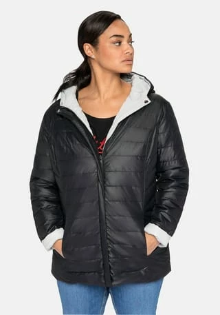 Welche Farbe darf es heute sein? Die Jacke von sheego ist beidseitig gesteppt und daher von beiden Seiten zu tragen. Praktisch und sportiv zugleich wirkt die Kapuze, der durchgehende Reißverschluss wird durch Druckknöpfe ergänzt. Eingrifftaschen vorn ergänzen den Style. Die leicht wärmende Wattierung und die wasserabweisende Qualität machen den Style zur perfekten Übergangsjacke.